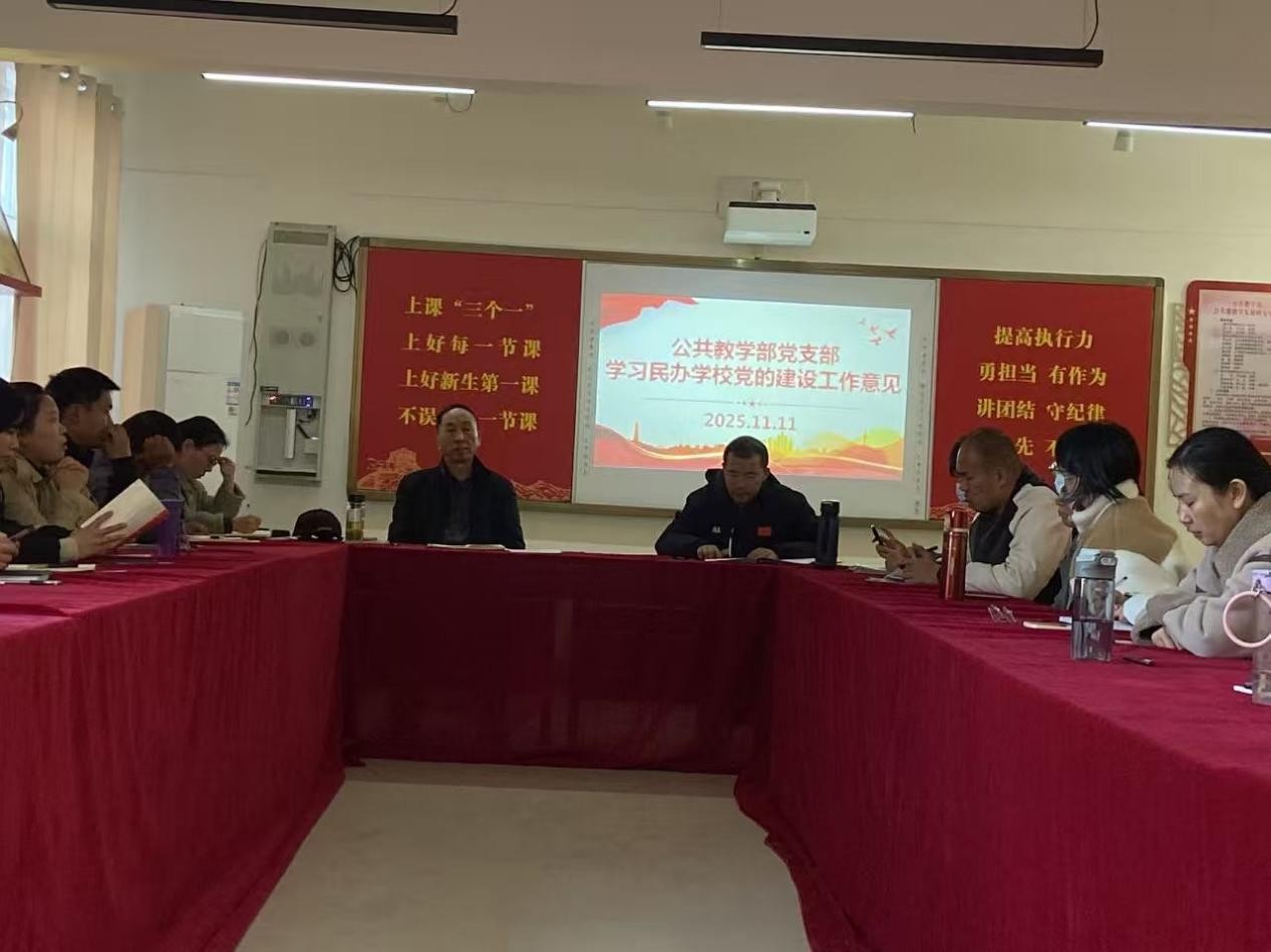 为深入贯彻落实新时代党的建设总要求,切实加强民办高校党的建设,筑牢社会主义办学根基。11月11日下午,公共教学部党支部在党员活动室开展主题党日活动专题学习会,集中学习《中共中央办公厅关于加强民办学校党的建设工作的意见》。党支部书记王华杰主持会议,全体党员教师参加学习。