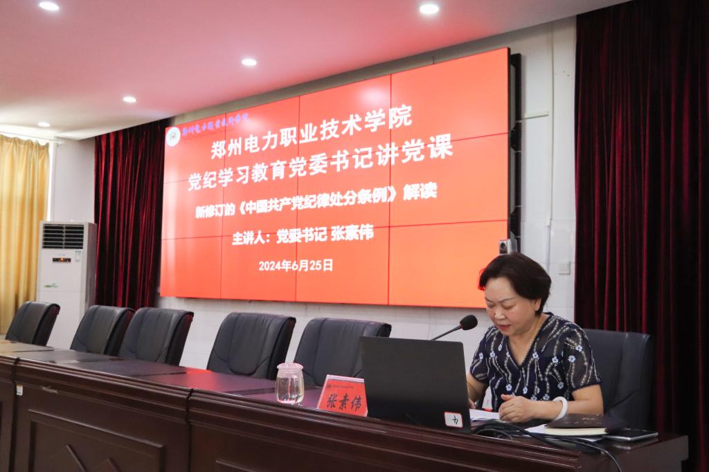 6月25日下午,我校在办公楼五楼会议室举行郑电大讲堂第一讲,校党委书记张素伟讲授党纪学习教育专题党课。