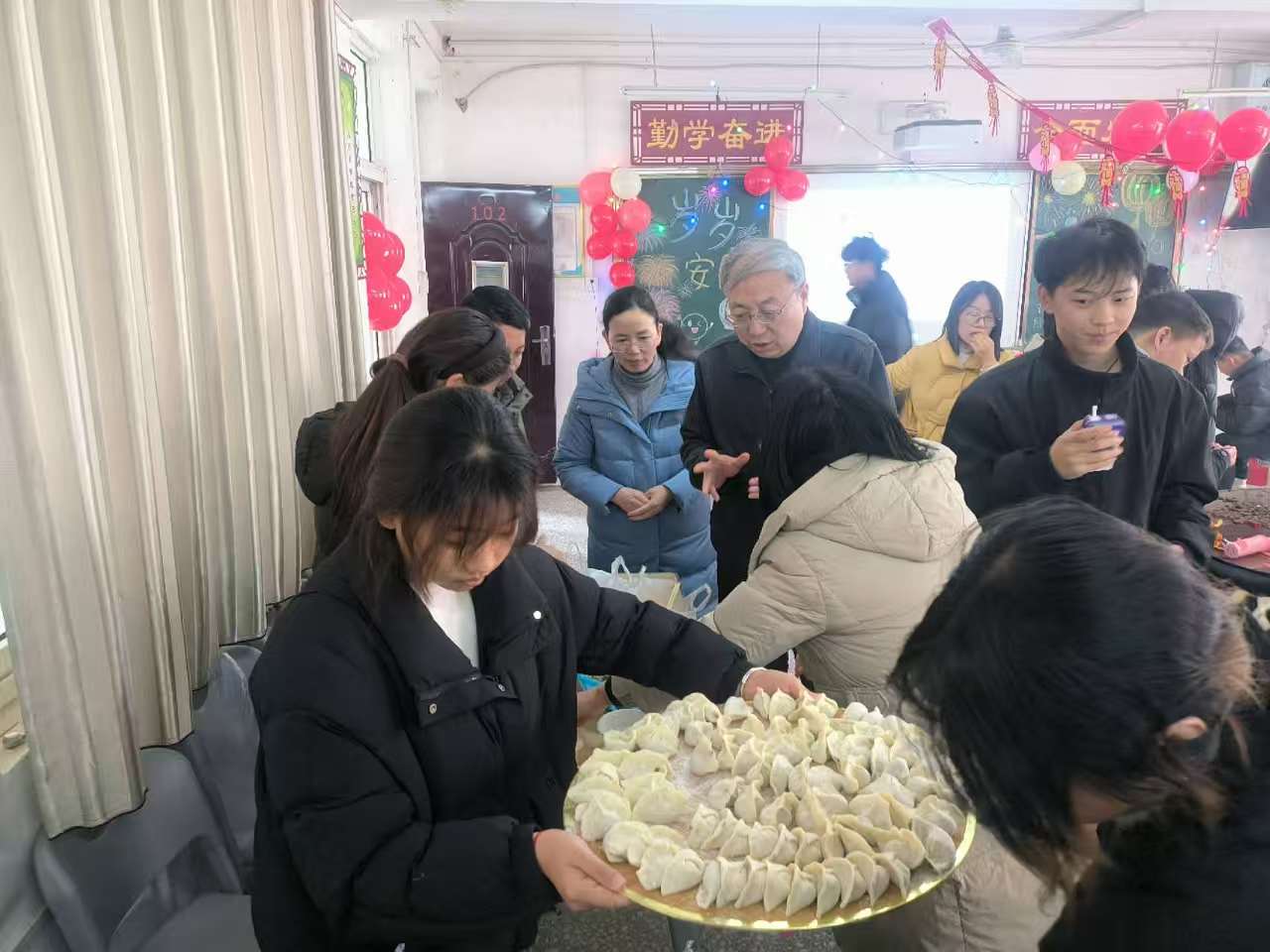 冬至大如年,人间小团圆。冬至佳节来临之际,为传承中华优秀传统文化,厚植校园人文温情,切实把暖心育人落到实处,绿色低碳技术学院党支部在2号教学楼102会议室,举行“相约冬至 温暖过节”文化育人实践活动。校领导穆教授应邀亲临现场,与全院学子围桌而坐、携手包饺子,在温情烟火中传递关怀暖意,于欢声笑语里共叙师生深情,让这个寒意渐浓的冬日,洋溢着满满的温情与暖意。校长助理、绿色低碳技术学院党支部书记魏继红、学生处副处长王丽君、党支部副书记杨向涛、副院长马艳丽、学院全体专兼职辅导员、任课教师及学生代表共同参与活动。