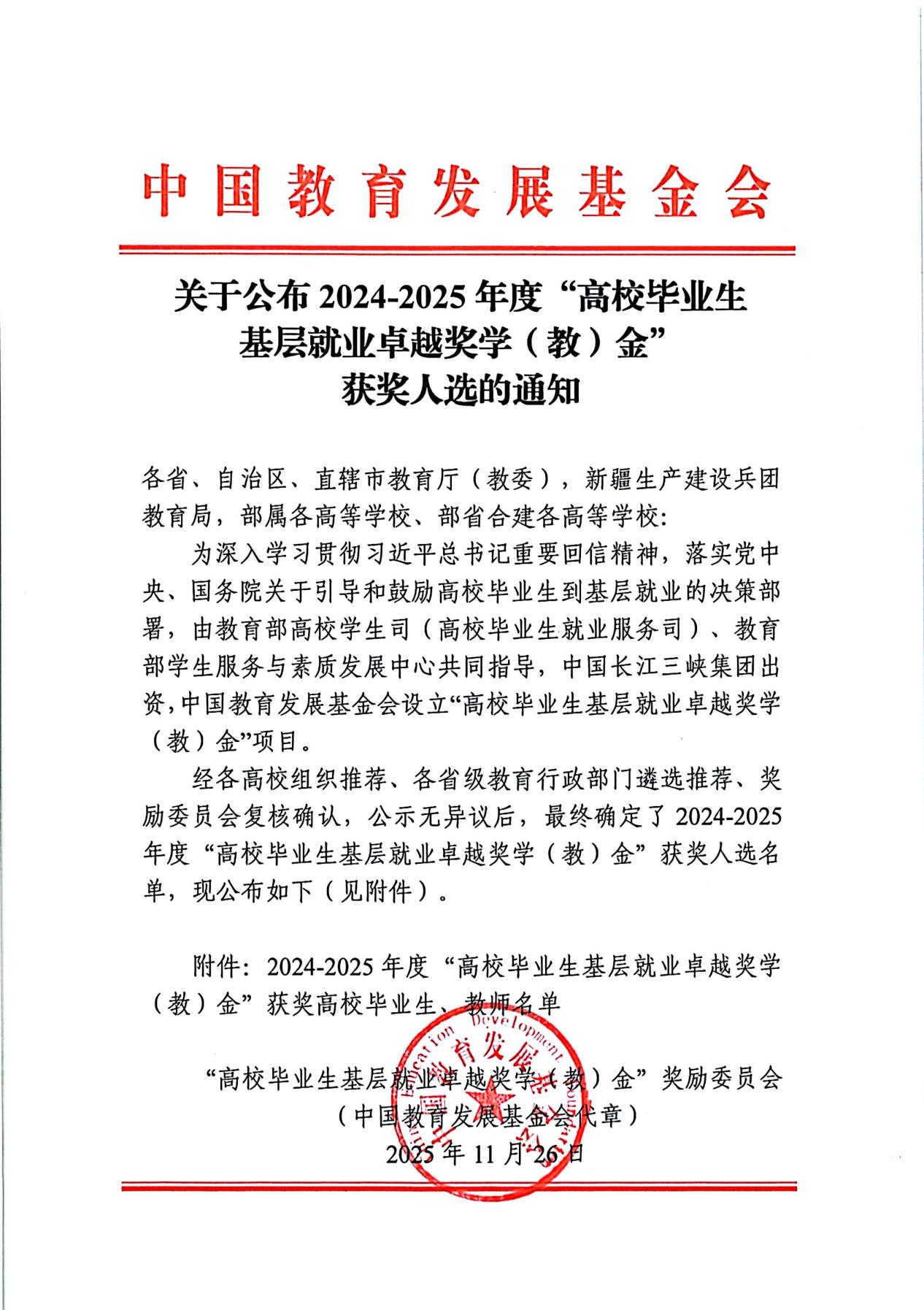 近日,教育部、中国教育发展基金会公布2024-2025年度“高校毕业生基层就业卓越奖学(教)金”获奖名单。我校电力工程学院毕业生张松成功入选,成为我校首位获此国家级荣誉的校友。“高校毕业生基层就业卓越奖学(教)金”由教育部高校学生司(高校毕业生就业服务司)、教育部学生服务与素质发展中心指导、中国长江三峡集团出资、中国教育发展基金会设立,每年评选一次,旨在引导和鼓励高校毕业生到基层就业。本次评选全国仅表彰418名高校毕业生。