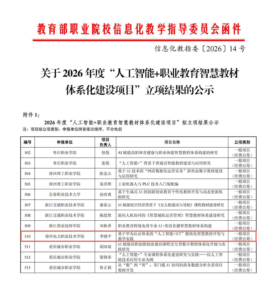 近日,教育部职业院校信息化教学指导委员会正式公布2026年度“人工智能+职业教育智慧教材体系化建设项目” 立项结果。经专家严格评审,全国共遴选出立项建设专项项目 523 项,其中重大项目1项、重点项目57项、一般项目 132项、一般项目(经费自筹)333项。河南省共有29项入选,我校喜获其中一席,科研立项工作再添硕果。
