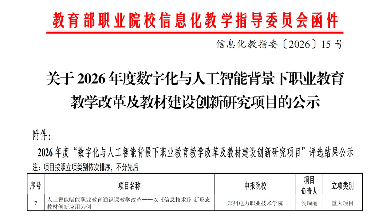 近日,教育部职业院校信息化教学指导委员会发布2026年度“数字化与人工智能背景下职业教育教学改革及教材建设创新研究项目”立项公示。本次拟立项441项,其中重大项目仅7项。我校成功入选重大项目1项,是河南省唯一获此殊荣的高校。