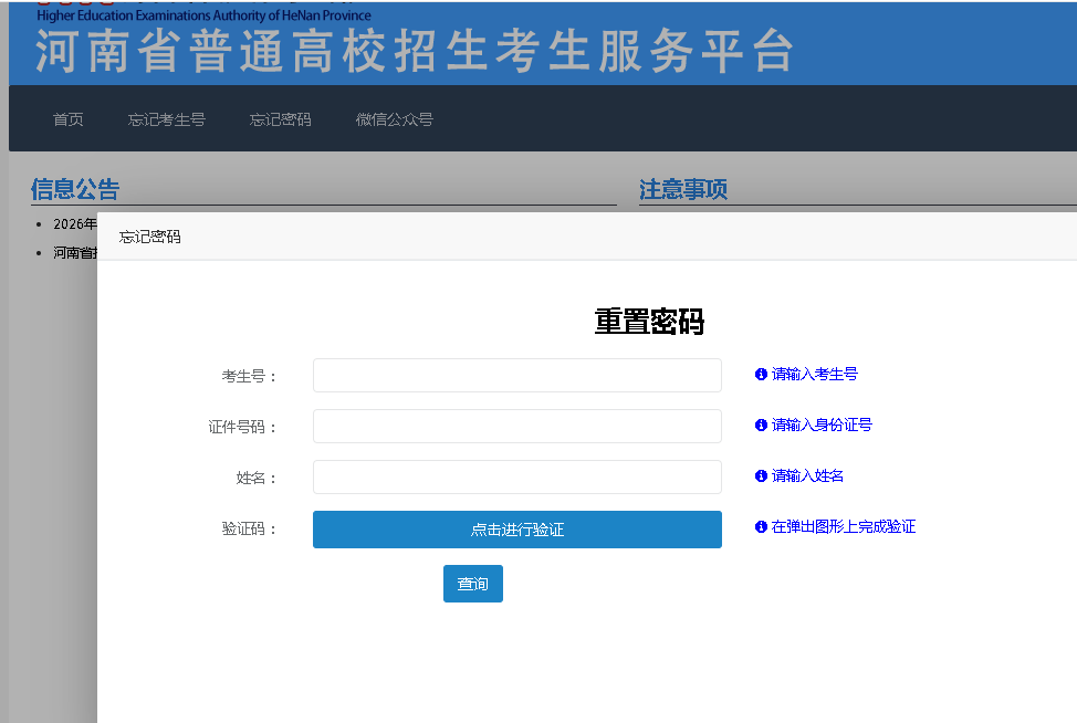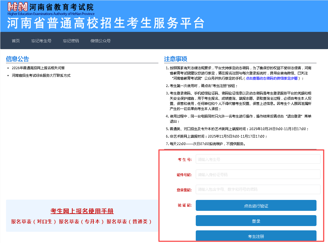 2.进入考生服务平台后,请仔细阅读“信息公告”区、“注意事项”区发布的政策公告和注意事项