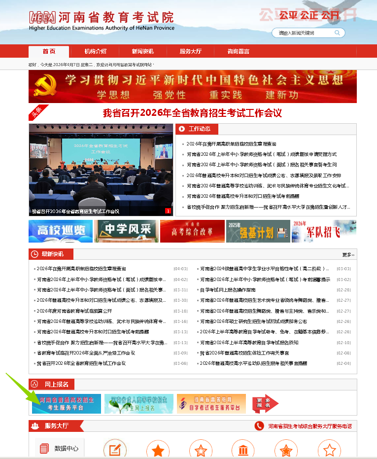 1.考生登录河南省教育考试院官网(https://www.haeea.cn/),找到首页“网上报名”点击“河南省普通高校招生考生服务平台”或直接访问河南省普通高校招生考生服务平台(https://pzwb.haeea.cn/stu)。