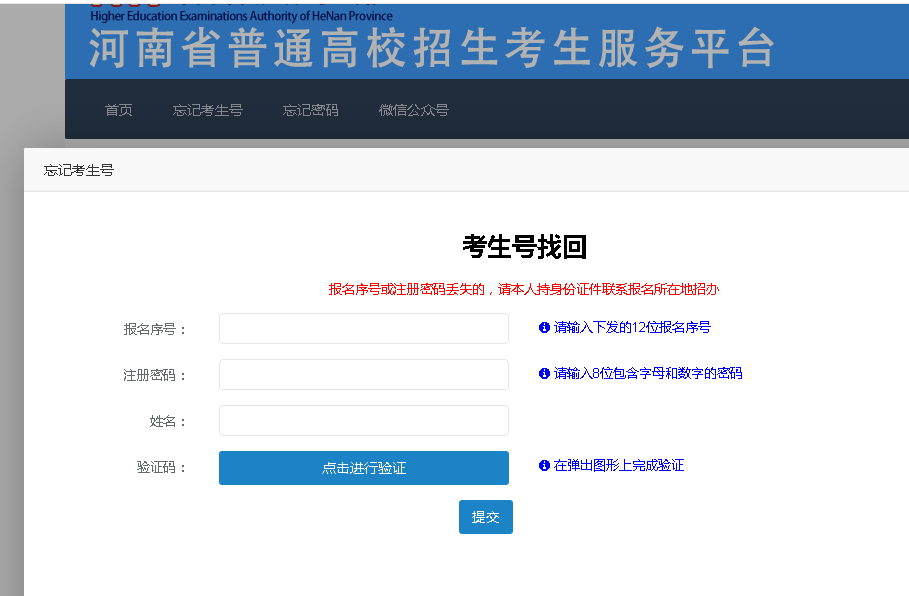 4.如果考生忘记自己的考生号和密码可以通过菜单栏的“忘记考生号”和“忘记密码”菜单项找回考生号和重置自己的密码(找回考生号时需要报名注册时的12位报名序号和注册密码,若以上信息找不到,可以查看个人报名信息登记表上的考生号或联系学校老师)。