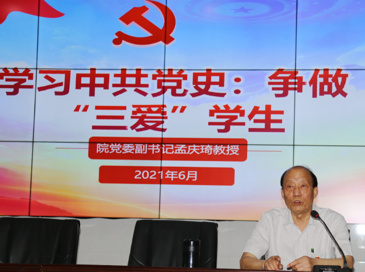 6月17日下午,我院办公五楼宽敞明亮的大会议室内,数百学子端庄整座,静耳聆听;讲台上《学习中共党史争做“三爱”学生》标幅,亮眼醒目。由院党委副书记孟庆琦教授主讲的“学习中共党史 引领学子爱学习 爱劳动 爱祖国”专题讲座,正在这里温馨举行。