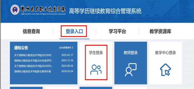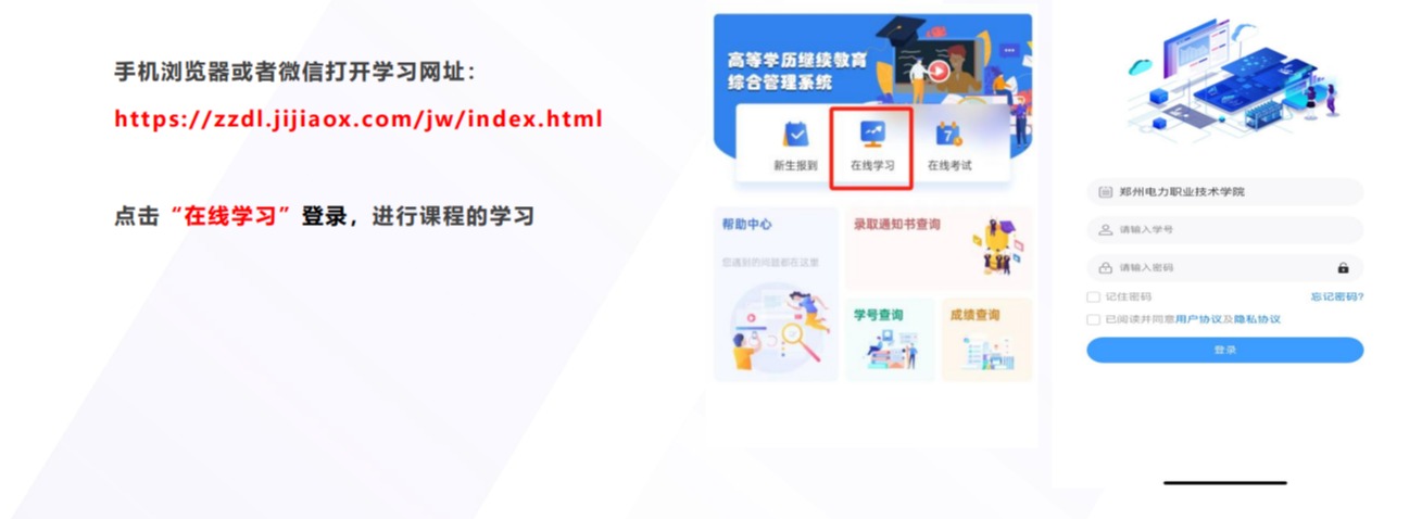 学生须登录学习平台进行网上课程学习(网址:https://zzdl.jijiaox.com/jw/index.html)。首次登录账号为学生学号(录取通知书上可查看),新生初始密码123456。 首次登录后须完善并认真核对个人信息,信息有误须立即上报班主任,由其统一报送学院更正。登录系统后可查询个人学籍、课程安排及学校通知公告等。