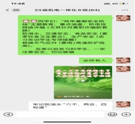重拳反诈,守好“钱袋子”:针对学生暑期兼职、社会实践需求旺盛的特点,班会深入剖析了当前高发的兼职刷单、网络贷款、冒充客服、游戏交易等诈骗“新套路”与“升级版”话术。辅导员结合真实案例,详细拆解诈骗步骤,传授“不轻信、不透露、不转账”的“三不”原则,并重点指导安装注册“国家反诈中心”APP及开启预警功能,提升学生主动防御能力;严防溺水,绷紧“生命弦”:结合暑期高温及我省水域特点,班会再次敲响防溺水警钟。通过播放警示教育片、讲解“六不两会”知识(不私自下水游泳、不擅自与他人结伴游泳等;发现险情会相互提醒劝阻并报告、会基本的自护自救方法),强调远离危险水域,引导选择正规、安全的亲水活动;平安出行,系好“安全带”:针对学生暑期出行、返乡、实习通勤等场景,班会强化交通安全规则教育。重点提示遵守交通法规,拒绝乘坐无牌无证、超载车辆,骑行电动车佩戴头盔,恶劣天气谨慎出行,长途旅行保持通讯畅通;健康饮食,把好“入口关”:结合夏季高温潮湿、食物易腐变的特点,班会普及食品安全与饮食卫生要点。提醒学生注意食品购买渠道、储存条件、加工卫生,不食用“三无”产品、过期变质食品和不明野生菌类,预防食物中毒及肠道传染病;护航实习,拧紧“安全阀”:特别聚焦在外实习学生的生产安全,是本次班会的重中之重。辅导员详细讲解了实习岗位安全操作规程、劳动防护用品正确佩戴使用、危险源辨识与应急处理流程,并强调遵守实习单位规章制度、保持与校方及指导老师的密切联系。要求实习学生每日报平安,遇有安全隐患或权益受损情况必须第一时间报告;应对极端,撑起“防护伞”:针对近期频发的暴雨、高温等极端天气,班会提供了实用的防护指南。暴雨天气强调避免涉水行走、防范触电、地质灾害避险;高温天气提示科学防暑降温、合理安排户外活动时间、警惕热射病症状及急救措施。
