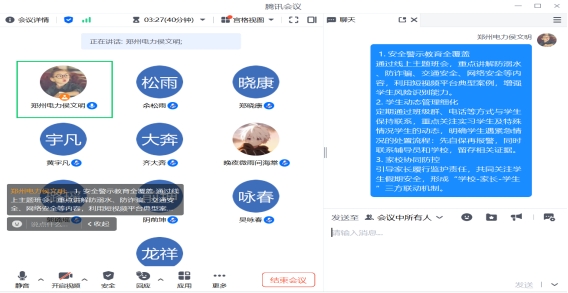为深入贯彻落实河南省教育厅及学校关于暑期学生安全工作系列重要部署,深刻认识当前安全稳定工作的极端重要性,机电工程学院于7月29日至31日精心组织、周密部署,面向全体学生开展了“筑牢暑期安全防线”线上主题班会系列活动。本次行动立足学院学生特点,强化家校社协同联动,以高度的政治责任感和扎实细致的工作作风,切实守护全院2000余名学生的生命安全与身心健康,为暑期校园安全稳定构筑起坚实屏障。