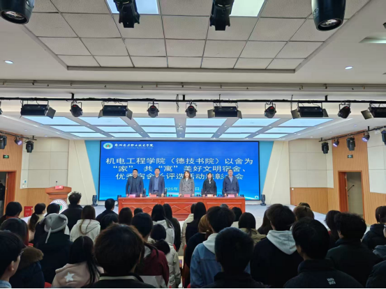 为深化“一站式”学生社区(书院)育人功能,筑牢校园安全防线,发挥榜样示范引领作用,完善“三全育人”工作体系,2025年11月13日晚,机电工程学院(德技书院)在校报告厅隆重举办“以舍为‘家’ 共‘寓’美好”文明宿舍与优秀宿舍长表彰大会暨消防安全知识讲座。机电工程学院院长兼党总支书记潘爱民,校学生处副处长、公寓管理中心副主任王丽君,学院党总支副书记刘增,书院办负责人袁国钦,及2024级、2025级全体专兼职辅导员、宿舍长共400余人参会,会议由学院团总支书记刘超主持。