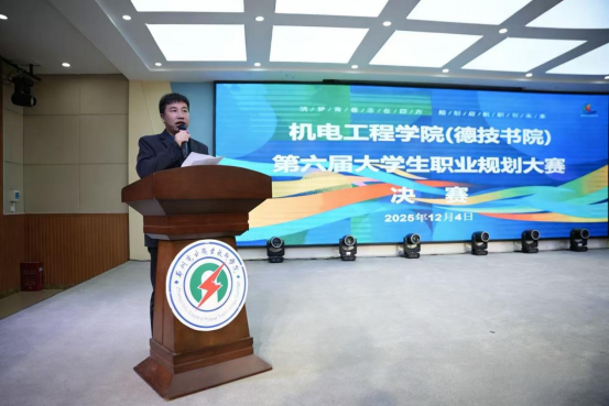 2025年12月5日晚,机电工程学院(德技书院)第六届大学生职业规划大赛学院决赛在学校报告厅隆重举行。本次大赛作为学院深化职业发展指导、推进学风建设与分类培养的品牌活动,得到校级领导与各部门的高度关注和大力支持。学校副校长连银岭,校学生处处长、团委书记宋磊,校大学生就业创业中心主任钟智,机电工程学院院长兼党总支书记潘爱民、常务副院长赵永刚等校院领导,各行政处室及二级学院负责人莅临现场指导,与24、25级全体学子共同见证这场聚焦职业发展、赋能成长成才的青春盛宴。