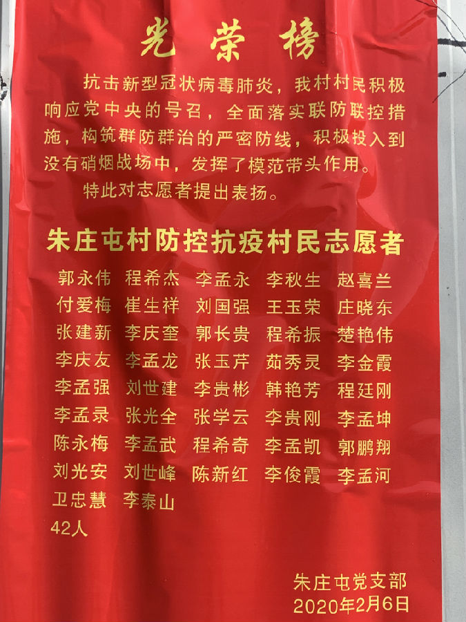 “很意外上了村里的光荣榜,我只是做了一点点,尽了绵薄之力,希望疫情早日得到控制,中国加油!”他们勇于担当,主动作为,用赤子之心表达爱国之情,筑牢抗疫防线。