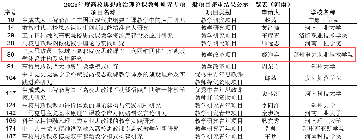 近日,教育部发布了关于2025年度高校思想政治理论课教师研究专项一般项目评审结果的公示,其中,河南高校13个项目入选。我校马克思主义学院姬迎喜老师申报的《“大思政课”视域下高职院校思政课“一向四维四化”实践教学体系建构及应用研究》获批立项,标志着学校在思想政治研究方向实现国家级项目新突破。