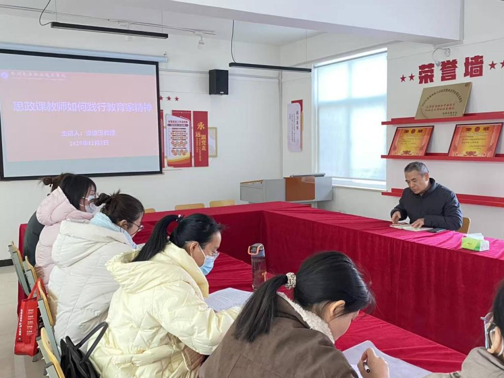 为深入学习贯彻党的二十届四中全会精神,落实《教育部办公厅关于开展2025-2026学年高校思政课课堂教学提升行动的通知》(教社科厅函〔2025〕10号)部署要求,切实增强思政课教师弘扬教育家精神的思想和行动自觉,根据校科研处统一安排,12月2日下午,马克思主义学院邀请河南师范大学教授,硕士生导师、安道玉博士作题为“思政课教师如何践行教育家精神”的专题讲座,讲座由学院教学副院长王利娟主持。