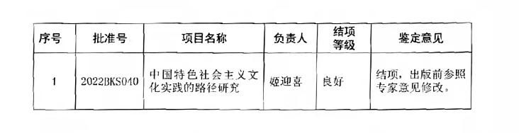 根据河南省哲学社会科学工作事务中心通知,我校由姬迎喜老师主持的“中国特色社会主义文化实践的路径研究”(项目批准号:2022BKS040)河南省哲学社会科学规划项目顺利结项,项目结项等级良好。