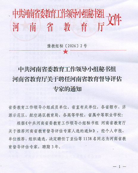 根据《中共河南省委教育工作领导小组秘书组 河南省教育厅关于聘任河南省教育督导评估专家的通知》,我院党支部书记姬迎喜被聘任为河南省教育督导评估专家,聘期三年,将负责参与各级各类教育的督导、评估与指导工作。