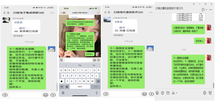 特别值得一提的是,为确保安全教育全覆盖,学院对正在校外实习的23级学生群体给予了特别关注。各辅导员通过班级微信群、QQ群等平台,持续推送假期安全温馨提示,内容涵盖旅途安全、防骗防盗、实习安全等各个方面,实现了安全教育“一个都不能少”的目标。