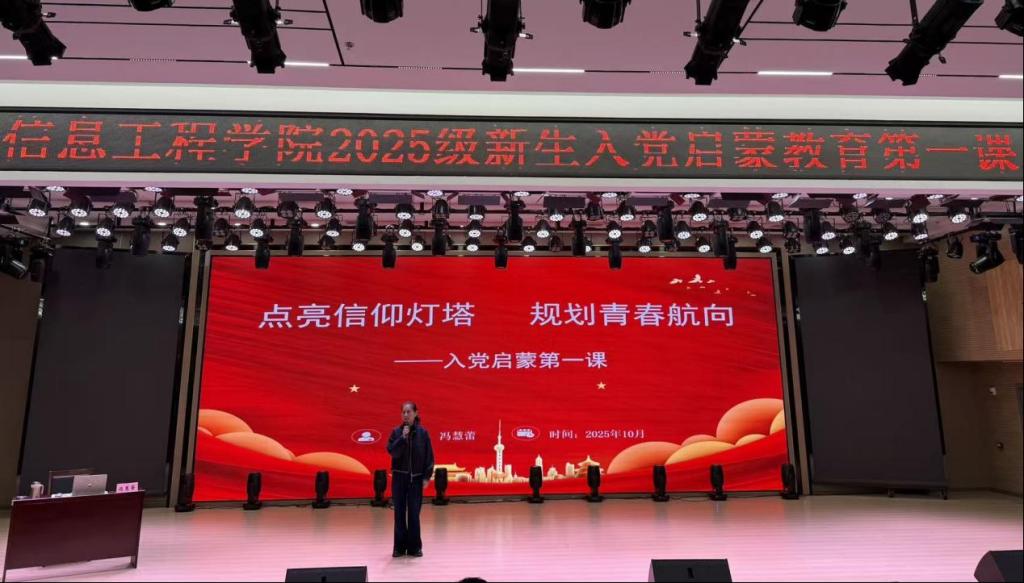 为引导新生筑牢理想信念之基、深化对党的理性认知,10月24日,信息工程学院开展2025级新生入党启蒙教育。信息工程学院党总支书记冯慧蕾系统的讲解了党的历史、党组织架构及党员发展流程,帮助新生明确入党路径,激发向党组织靠拢的政治热情,以清晰脉络、鲜活内容,为新生们上了一堂深刻的“入党第一课”。信息工程学院全体辅导员和2025级全体新生参会。会议由学院党总支副书记宋怀阳主持。