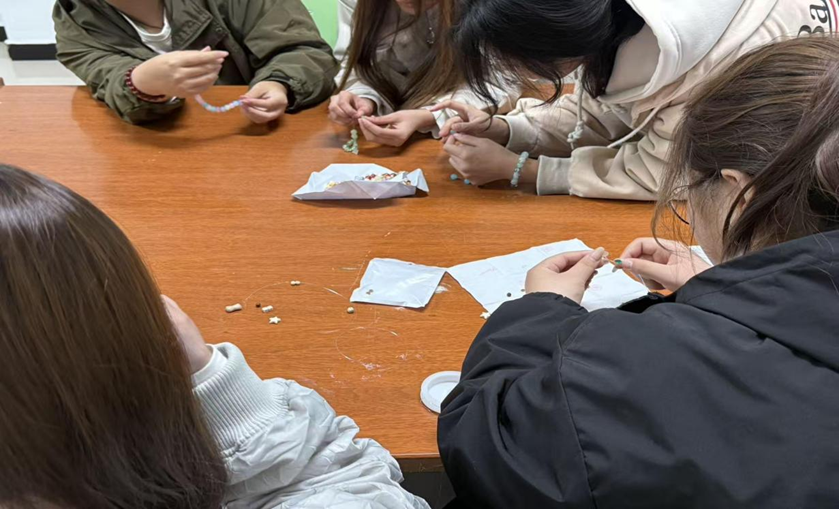随着各式珠料、配饰与线材分发到位,大家迅速投入创作。教室渐渐安静,唯有珠玉轻碰、丝线穿引之声勾勒出专注的图景。现场参与状态各异:有人细致比对色彩与形状,有人从容搭配一气呵成,亦有协作互助的温暖场景——当珠子不慎滑落,总有身旁同学含笑俯身,共拾散落的光点。心理部工作人员穿梭其间,及时提供技术支持,确保每位同学都能享受手作乐趣。