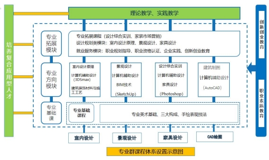 《室内设计原理》、《家具设计》、《景观设计》、《建筑制图》、《装饰材料与施工工艺》、《工程概预算》、《BIM技术》、《计算机辅助设计Photoshop》、《计算机辅助设计CAD》、《计算机辅助设计Sketch Up》、《计算机辅助设计3Dsmax效果图设计》